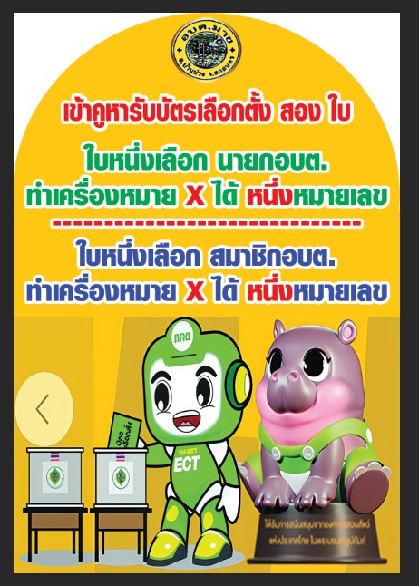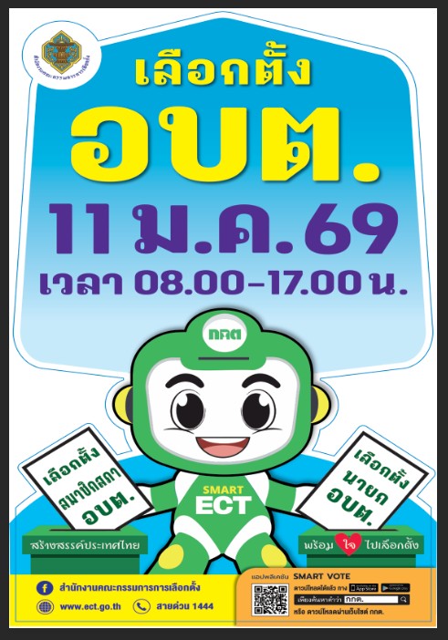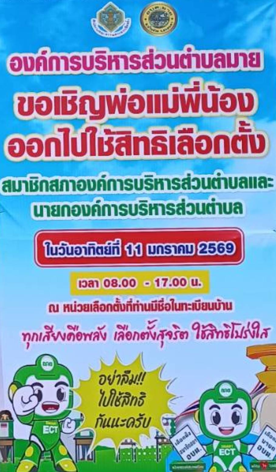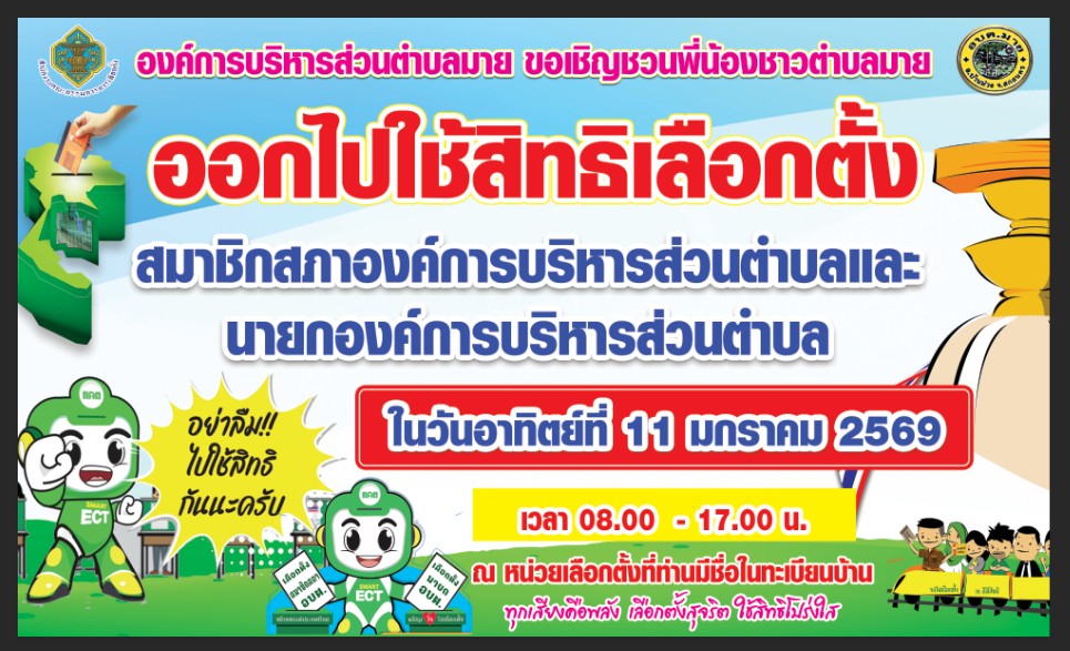 องค์การบริหารส่วนตำบลมาย ขอเชิญชวนพี่น้องชาวตำบลมาย ออกไปใช้สิทธิเลือกตั้ง สมาชิกสภาองค์การบริหารส่วนตำบลและนายกองค์การบริหารส่วนตำบล ในวันอังคาร ที่ 11 มกราคม 2569 เวลา 08.00 - 17.00 น. ณ หน่วยเลือกตั้งที่ท่านชื่อในทะเบียนบ้าน