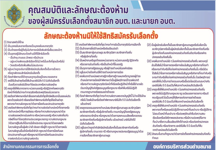 ข่าวประชาสัมพันธ์ ผู้ที่ประสงค์จะลงสมัคร อบต. อย่าลืมตรวจสอบคุณสมบัติและลักษณะต้องห้ามของตนเองก่อนลงสมัครรับเลือกตั้งสมาชิกสภาองค์การบริหารส่วนตำบลและนายกองค์การบริหารส่วนตำบล