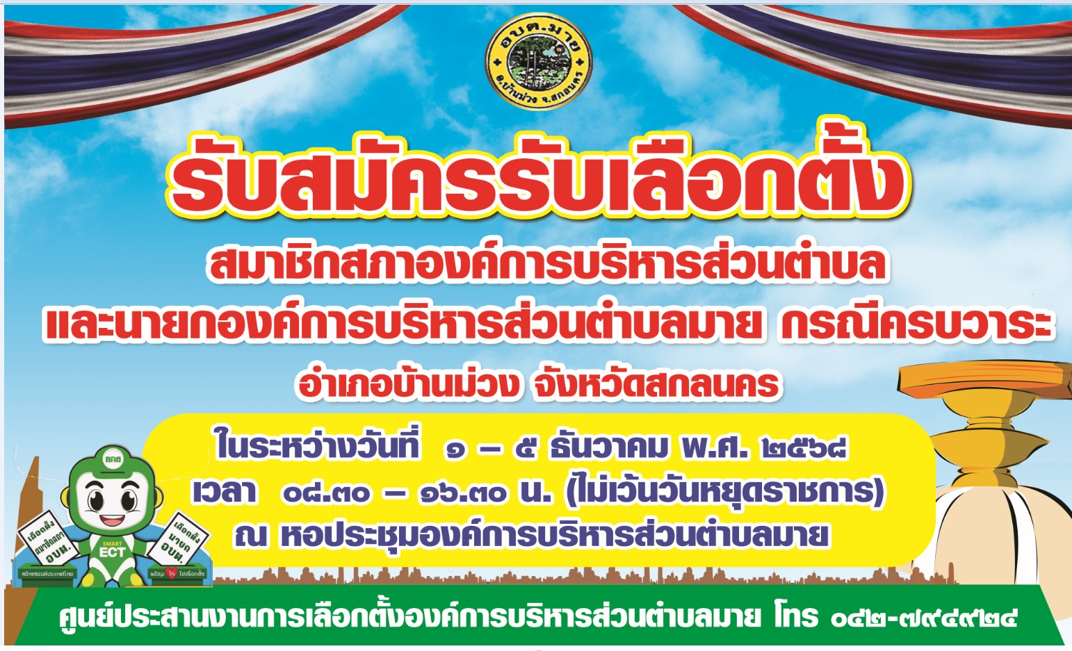 สถานที่รับสมัครเลือกตั้งสมาชิกสภาอง์กการบริหารส่วนตำบลและนายกองค์การบริหารส่วนตำบลมาย กรณีครบวาระ ในระหว่างวันที่่ 1 - 5 ธันวาคม 2568