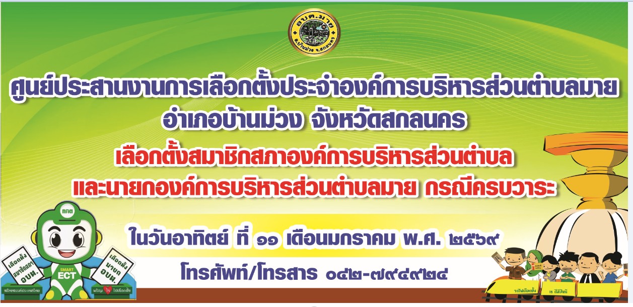 ยินดีต้อนรับสู่.... องค์การบริหารส่วนตำบลมาย อำเภอบ้านม่วง จังหวัดสกลนคร สอบถามข้อมูลโทร 042-794924 E-mail : tambonmai275@gmail.com