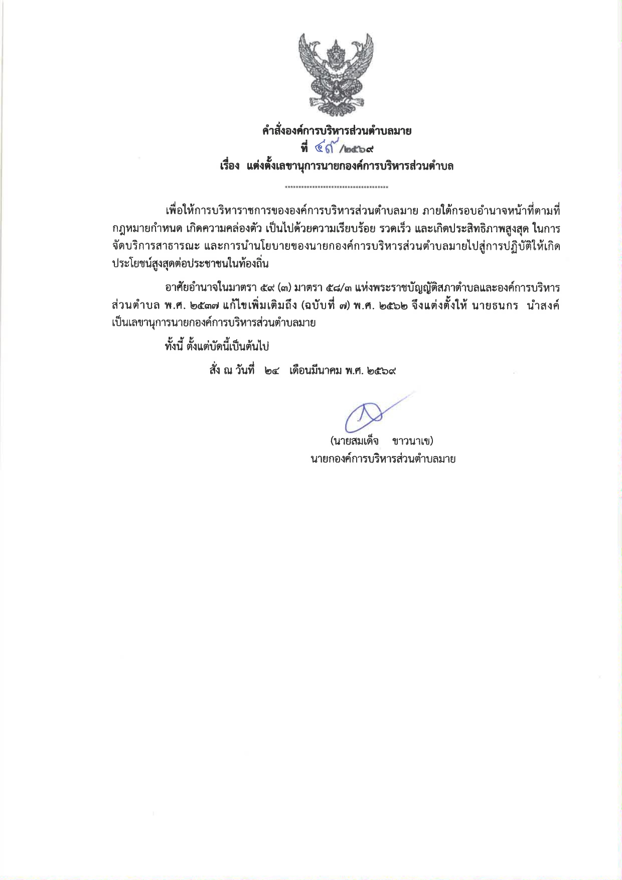 คำสั่งองค์การบริหารส่วนตำบลมาย ที่ 49/2569 เรื่อง แต่งตั้งเลขานุการนายกองค์การบริหารส่วนตำบล